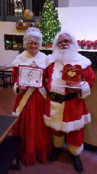 a pair of gloves, some pencils, crayons, a small stuffed animal and some candy. They also all get their picture with Santa to take home.